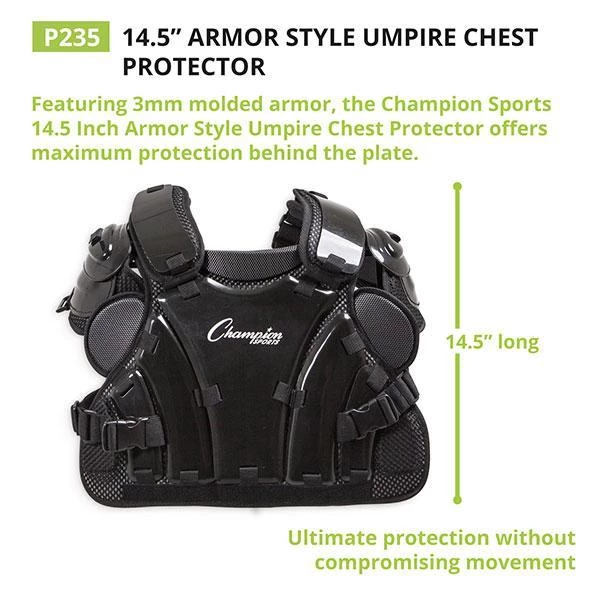 Featuring 3mm molded armor, the Champion Sports 14.5 Inch Armor Style Umpire Chest Protector offers maximum protection behind the plate. With a DryTek™ mesh liner and EverClean™ pads, this chest protector allows for exceptional breathability and prevents mold and mildew from accumulating in gear. The five-point harness and quick release clips of this umpire chest shield offer added convenience, while the contoured design provides a close, comfortable fit.