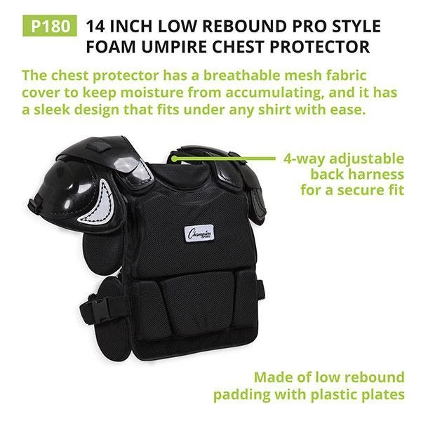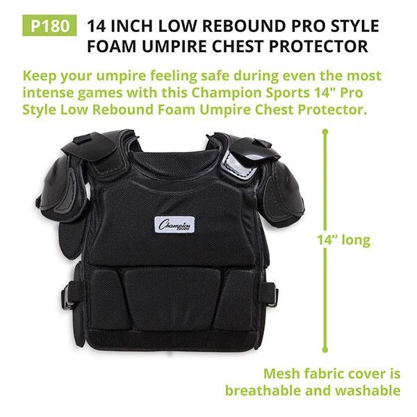 Keep your umpire feeling safe during even the most intense games with this Champion Sports 14″ Pro Style Low Rebound Foam Umpire Chest Protector. It has plastic plates and low rebound foam padding to absorb impacts from foul balls, and the four-way harness at the back adjusts to hold it securely in place. The chest protector has a breathable mesh fabric cover to keep moisture from accumulating when the action picks up, and it has a sleek design that fits under any shirt or sleeve with ease.