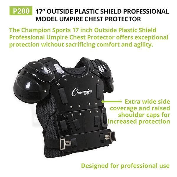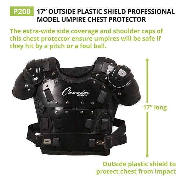 Made from lightweight, breathable padding and a plastic outer shell, the Champion Sports 17 inch Outside Plastic Shield Professional Umpire Chest Protector offers exceptional protection without sacrificing comfort and agility. The extra-wide side coverage and shoulder caps of this chest protector ensure umpires will be safe if they hit by a pitch or a foul ball. Designed for professional use, this umpire chest shield is great for amateur or professional leagues.