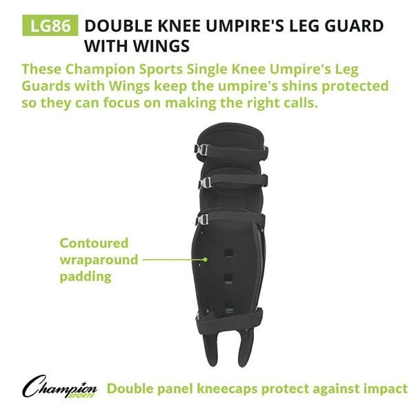 These Champion Sports Single Knee Umpire’s Leg Guards with wings keep the umpire’s shins protected from wild pitches so they can focus on making the right calls behind the plate. They have a double knee design with plenty of padding and double panel kneecaps to safely absorb impacts when the umpire is in a crouched position. The leg guards are designed for maximum movement, with full wings and contoured wraparound padding for additional comfort and support.