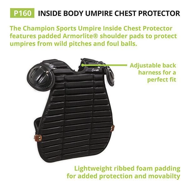Designed for extra protection without sacrificing comfort, the Champion Sports Umpire Inside Chest Protector features padded Armorlite® shoulder pads to protect umpires from wild pitches and foul balls. The separate arm pads and ribbed foam padding of this chest protector offer added protection while also remaining lightweight and providing a full range of motion. The adjustable back harness tailors to any size for a perfect fit.