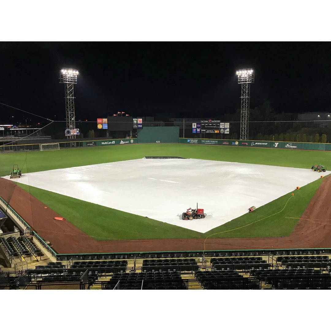 Infield Covers are stocked in a lightweight triple coated UV resistant white/black or white/silver woven polyethylene in a 12(6.3 oz./yd.) or 15(7.0 oz./yd.) mil material. Each cover has handles every 15� and grommets every 10� around the perimeter with a hemmed edge. We offer the Athletic Field Cover in 4 commonly used standard sizes and can custom make one to your specifications if needed.