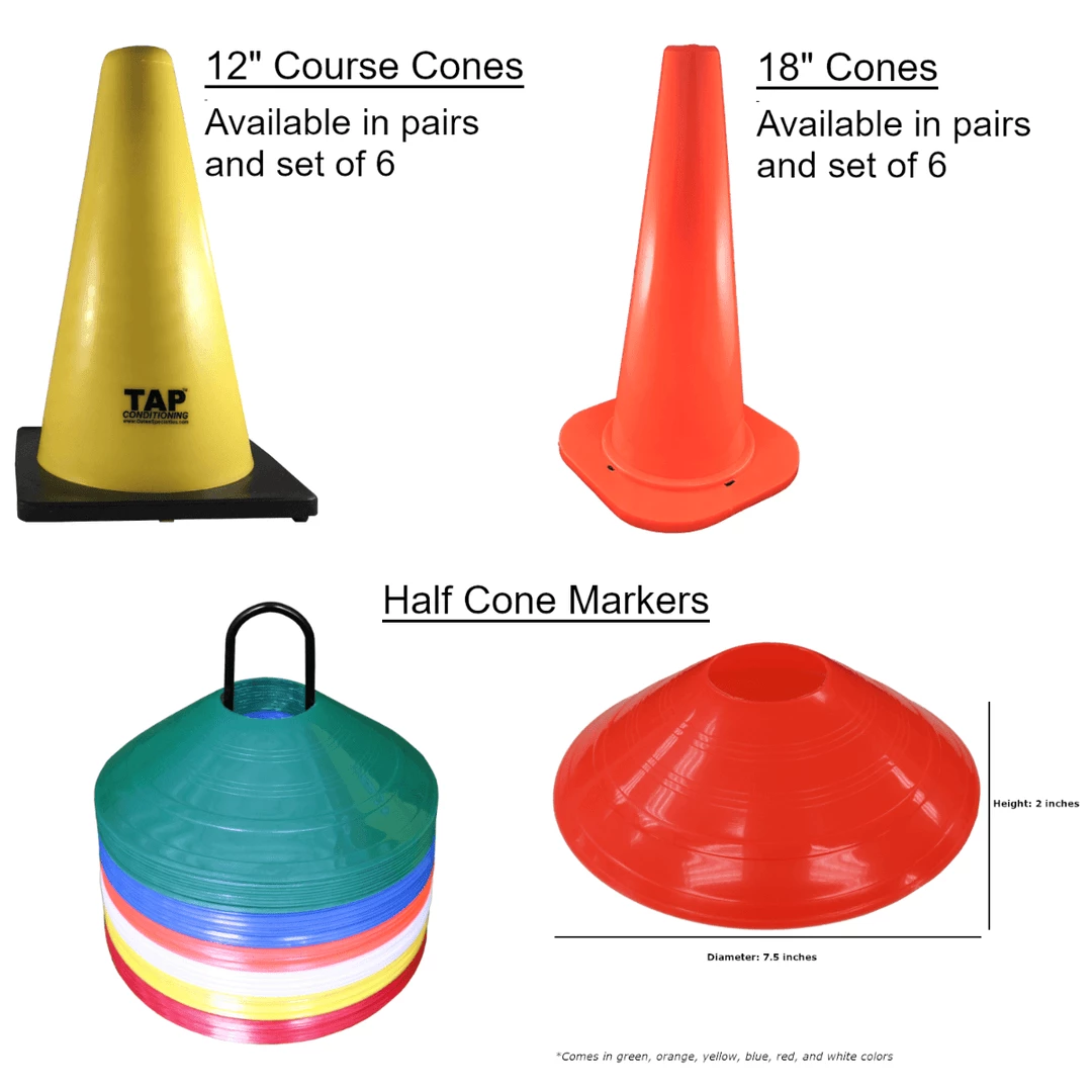 We have half cone markers, 12′, or 18′ cones for speed and agility drills or setting boundaries for your warm-ups.