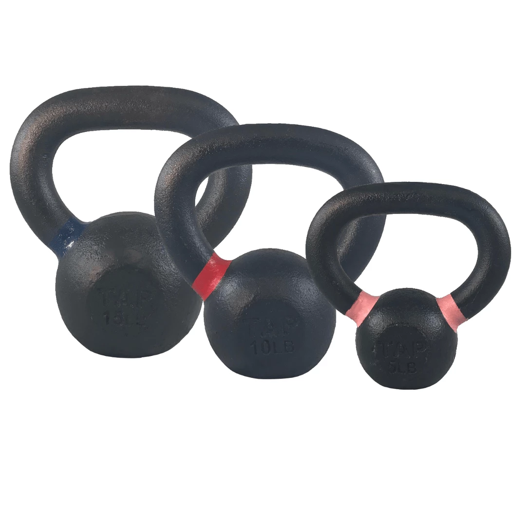 The TAP Kettlebells are black powder-coated cast iron implements and are available in three weights: 5lb, 10lb, and 15lb.