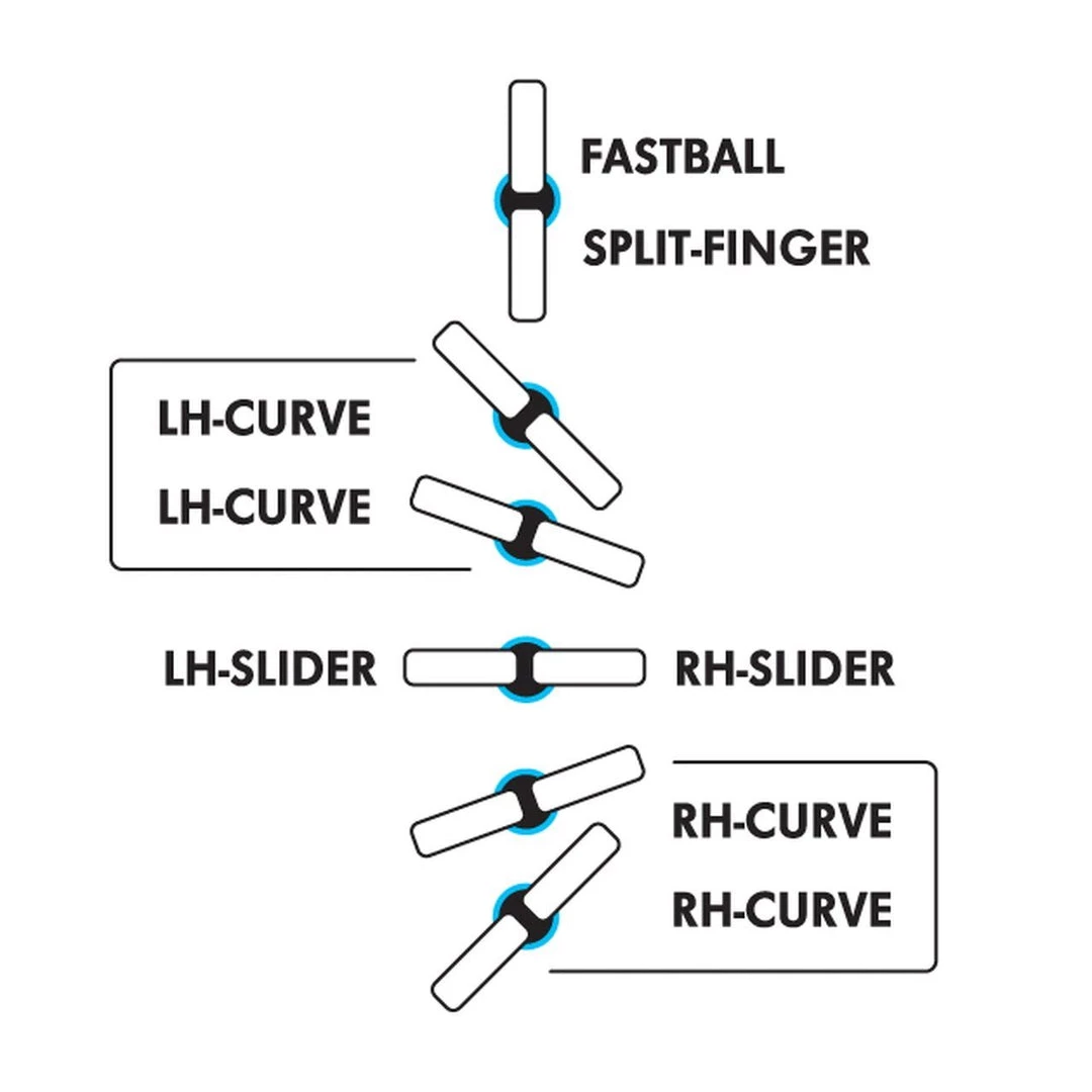 - Throws Fastballs and splitfingers, left and right-hand curveballs, and left and right-hand sliders using just one dial.