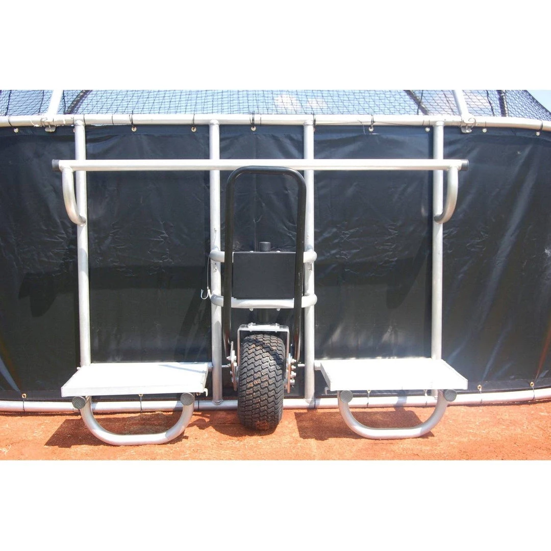 This hitting turtle is designed for use by high school, collegiate, and professional programs. The frame structure is 2” aluminum tubing with heavy-duty weather treated knotless netting and solid vinyl black skirt. Large thud pad and baffle net protect rear of cage. Outer wheels turn 180 degrees and feature locking hubs with turf tires. Rear dolly assembly easily lifts and maneuvers cage. Padded rib bars feature welded placement guides for inserting lifting bars to safely raise cage. Lifting bars secure to ribs with safety cable and pin. Dual, folding observation decks at rear of cage allow for raised viewing of batter.